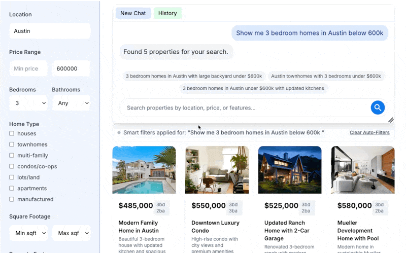 💬 Chatly introduces a conversational layer that acts as a real estate co-pilot with multi-turn conversations to support how customers work towards finding their dream home. Users can ask, “Show me homes in Austin between $500K and $800K” and then follow it up with “3 Bedroom and 2 Bathroom with a car garage” and Chatly understands, refines, and guides the search with contextual awareness.